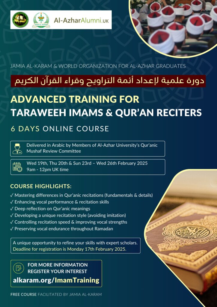 A six-day intensive online training programme for Taraweeh Imams & Qur’an Reciters was delivered in February 2025. This initiative was organised by Al-Azhar Alumni UK and the World Organisation for Al-Azhar Graduates – facilitated by Jamia Al-Karam, Retford.