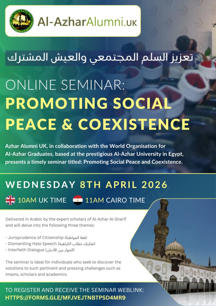 Al-Azhar Alumni UK, in collaboration with the World Organisation for Al-Azhar Graduates, based at the prestigious Al-Azhar University in Egypt, presents a timely seminar titled: Promoting Social Peace and Coexistence, taking place on Wednesday, 8th April 2026.